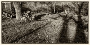 Because the chair simply sat out in the weather year after year, it had deteriorated to the point where a few days earlier it had collapsed when moved such that it was irreparable [or so I thought. My woodworking skills have since improved to where I now recognize that the crumpled seat could have been re-doweled and re-glued]. So it sat [as pictured] unusable by my father. One following morning, I was up early, [or more probable, still up from the previous evening], took the camera into the back yard and made this image. I then started to burn stuff and, unfortunately, used the chair as starter kindling as it was now, in my mind, ‘burnable junk’.
